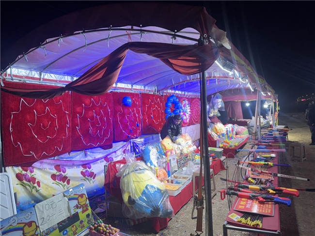 还未走近,红彤彤的“迎新春年货购物节展销会”拱门便映入眼帘,暖黄灯光裹着烟火气从摊位间漫出:香酥瓜子、多彩糖果堆成小山,现磨粮油的机器声混着摊主的吆喝,四件套、餐具等日用品摆满货架,游乐区的玩偶旁围满笑闹的孩童。这是当地延续多年的年俗——年前的集中展销会,让各地商户齐聚一处,也让居民不用奔波就能采买齐新鲜年货,从零食到日用品的“一站式”市集,成了新春前最热闹的“便民舞台”。