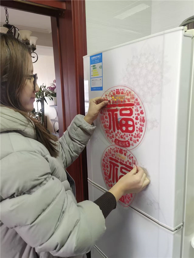 随后,队员们在厨房门、冰箱等位置贴上大红福字。鲜红的福字不仅增添了浓浓的年味,也传递着对新一年丰衣足食、阖家平安的美好祈愿。在传统习俗中,“福”字代表着福气与好运,贴在厨房等关键位置,更是希望灶神能将这份福气带回家中,保佑全家在新的一年里生活顺遂、幸福安康。